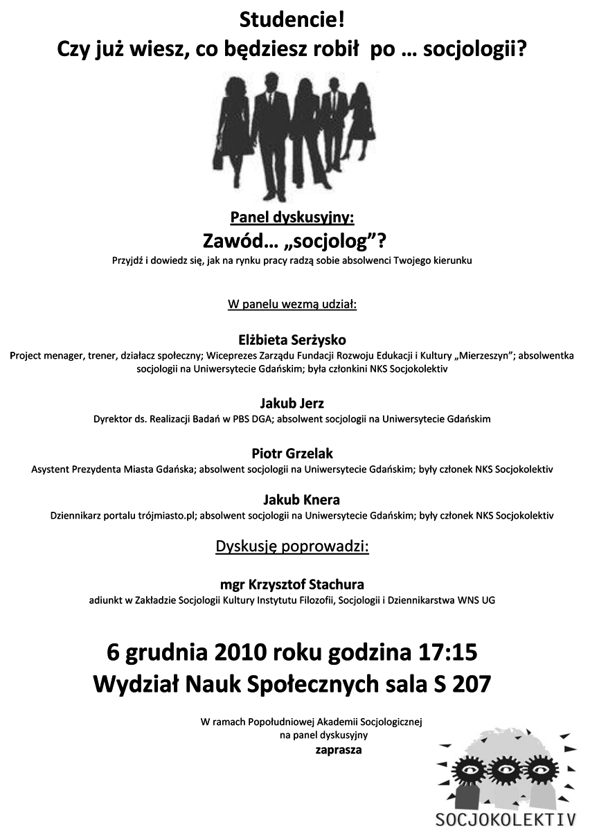 Mamy zaszczyt zaprosić wszystkich łaknących wiedzy na Panel dyskusyjny organizowany przez Naukowe Koło Socjologiczne SOCJOKOLEKTIV pt. "Zawód...Socjolog?". (Zobacz plakat!) Przy okazji polecamy zrealizowaną w 2008 roku sondę o tym samym tytule. (Zobacz sondę!)